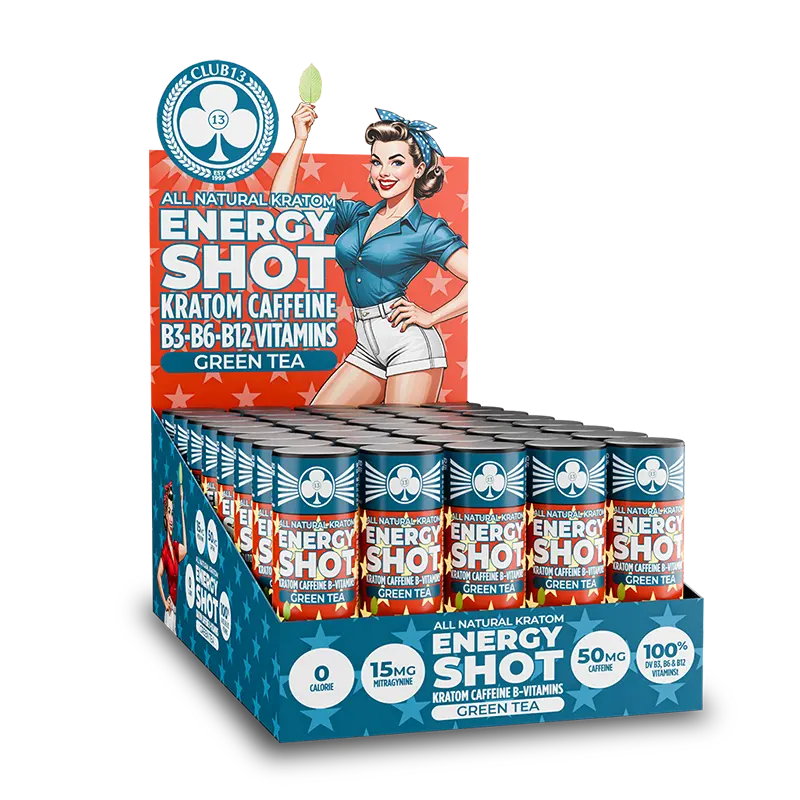 The Club13 All Natural Kratom Energy Shot combines kratom, caffeine, and B-vitamins for a clean, sustained energy lift. Each 13mL bottle delivers a balanced blend designed to enhance focus and endurance without the crash often found in energy drinks.